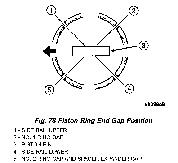 12. Position piston ring end gaps as shown in (Fig. 78). It is important that expander ring gap is at least 45° from the side rail gaps, but not on the piston pin center or on the thrust direction.