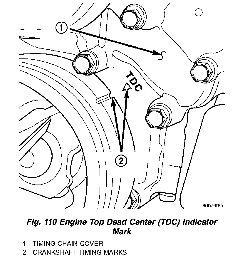2. Using a mirror, locate the TDC arrow on the front cover (Fig. 110). Rotate the crankshaft until the mark on the crankshaft damper is aligned with the TDC arrow on the front cover. The engine is now at TDC.