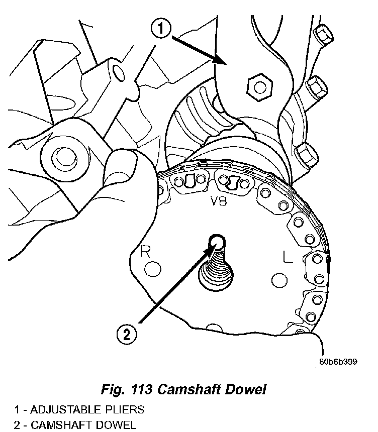 5. Using a suitable pair of adjustable pliers, rotate the camshaft until the alignment dowel on the camshaft is aligned with the slot in the camshaft drive gear (Fig. 113).