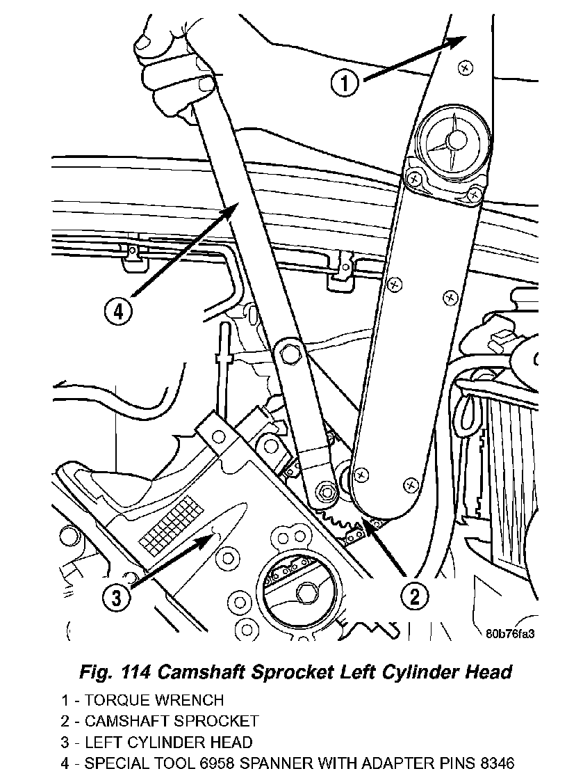 6. Position the camshaft drive gear onto the camshaft, remove oil from bolt then install the retaining bolt. Using Special Tools, Spanner Wrench 6958 with Adapter Pins 8346 and a suitable torque wrench, Tighten retaining bolt to 122 Nm (90 ft. lbs.) (Fig. 114) (Fig. 115).