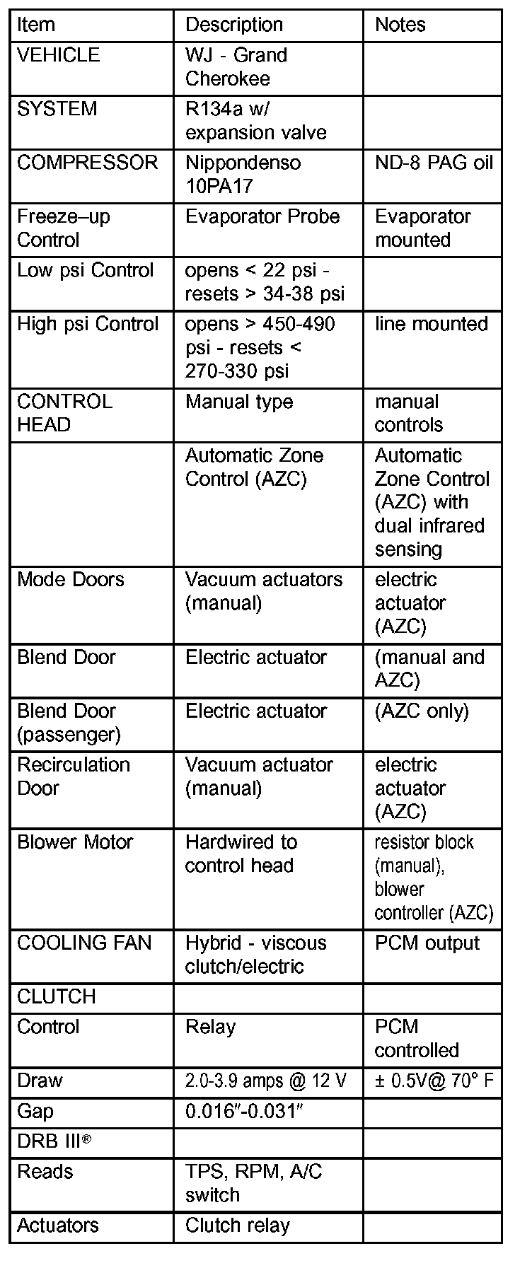 A/C Application Table: