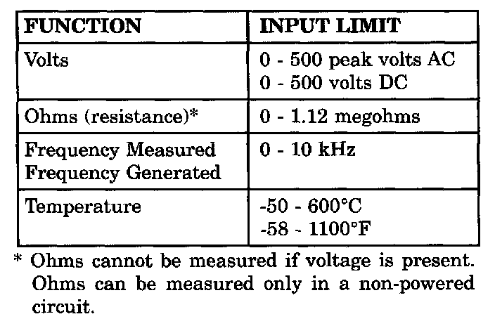 WARNING: EXCEEDING THE LIMITS OF THE DRBIII MULTIMETER IS DANGEROUS. IT CAN EXPOSE YOU TO SERIOUS INJURY. CAREFULLY READ AND UNDERSTAND THE CAUTIONS AND THE SPECIFICATION LIMITS.Follow the vehicle manufacturer's service specifications at all times.