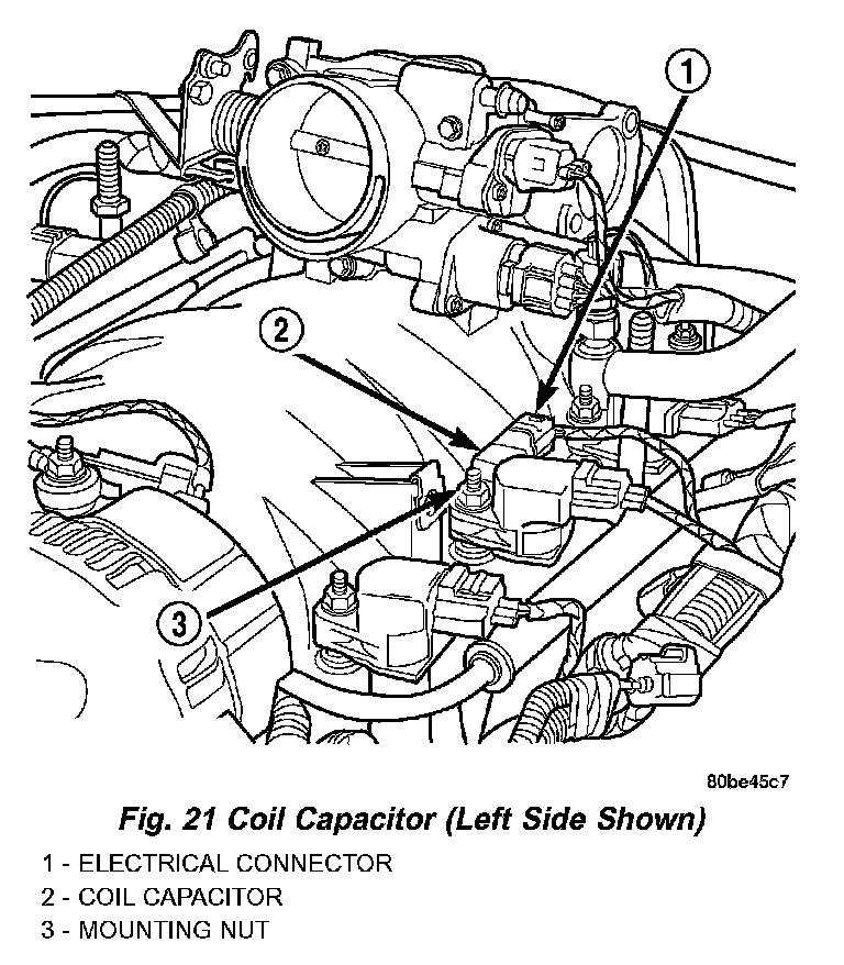 Two coil capacitors are used. One of them is located near the center of, and on the left side of the intake manifold. The other capacitor is located near the center of, and on the right side of the intake manifold.