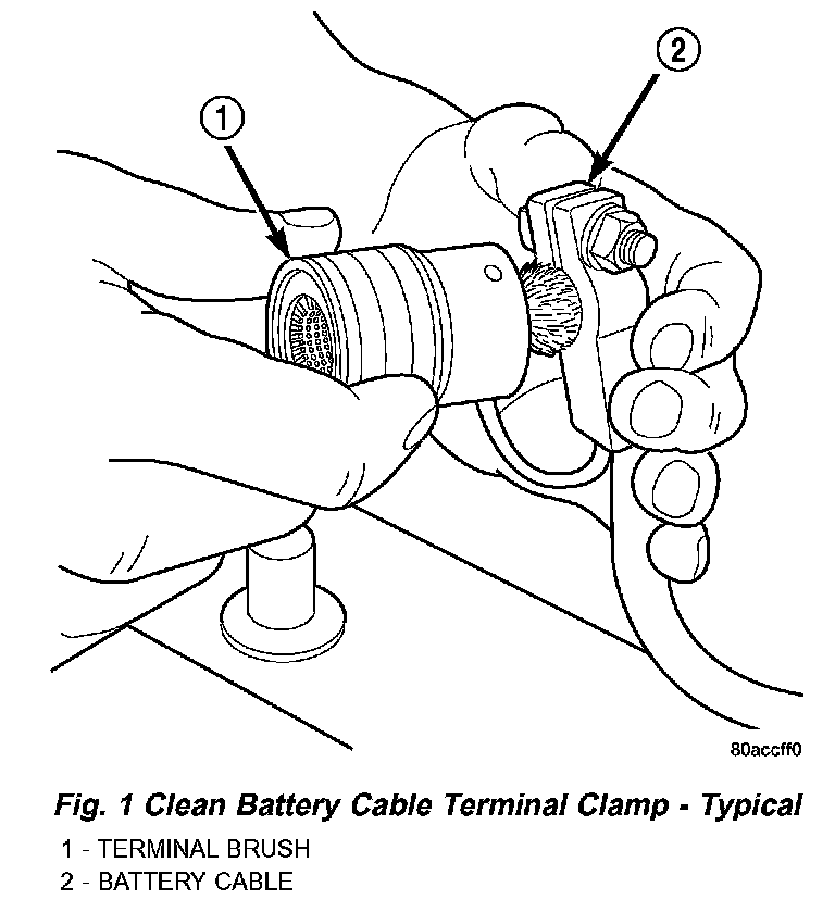 1. Clean the battery cable terminal clamps of all corrosion. Remove any corrosion using a wire brush or a post and terminal cleaning tool, and a sodium bicarbonate (baking soda) and warm water cleaning solution (Fig. 1).