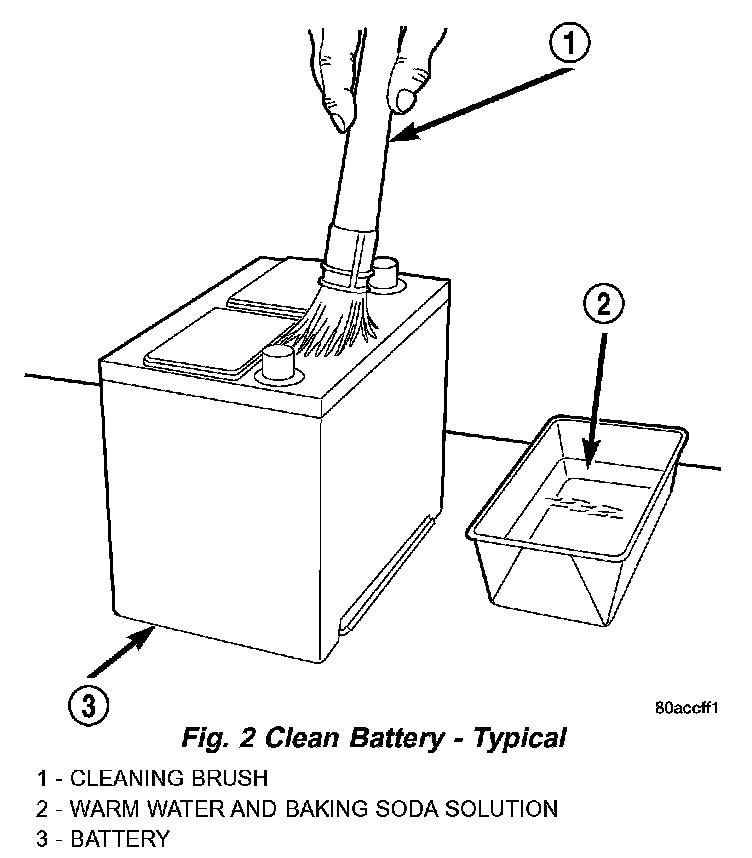3. If the removed battery is to be reinstalled, clean the outside of the battery case and the top cover with a sodium bicarbonate (baking soda) and warm water cleaning solution using a stiff bristle parts cleaning brush to remove any acid film (Fig. 2). Rinse the battery with clean water. Ensure that the cleaning solution does not enter the battery cells through the vent holes. If the battery is being replaced, refer to Battery System Specifications for the factory-installed battery specifications. Confirm that the replacement battery is the correct size and has the correct ratings for the vehicle.