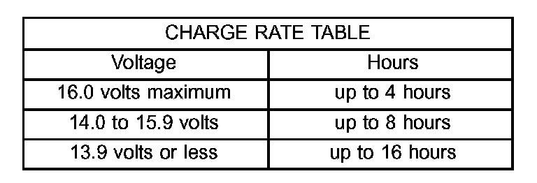 3. Battery chargers vary in the amount of voltage and current they provide. The amount of time required for a battery to accept measurable charging current at various voltages is shown in the Charge Rate Table. If the charging current is still not measurable at the end of the charging time, the battery is faulty and must be replaced. If the charging current is measurable during the charging time, the battery may be good and the charging should be completed in the normal manner.