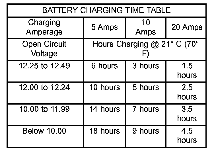 The Battery Charging Time Table gives an indication of the time required to charge a typical battery at room temperature based upon the battery state-of- charge and the charger capacity.