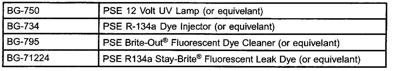 4. Check for leaks. Using a BF-750 12 volt UV Lamp (or equivalent), scan all lines, fittings, and components. The exact location of the leak(s) will be pinpointed by a bright yellow/green glow of dye. When checking for evaporator leak(s) shine the UV light at the evaporator drain hole to check for traces of dye. If traces of dye appear at the drain hole, check the evaporator and connections when the unit is removed from the vehicle. Verify leak location.