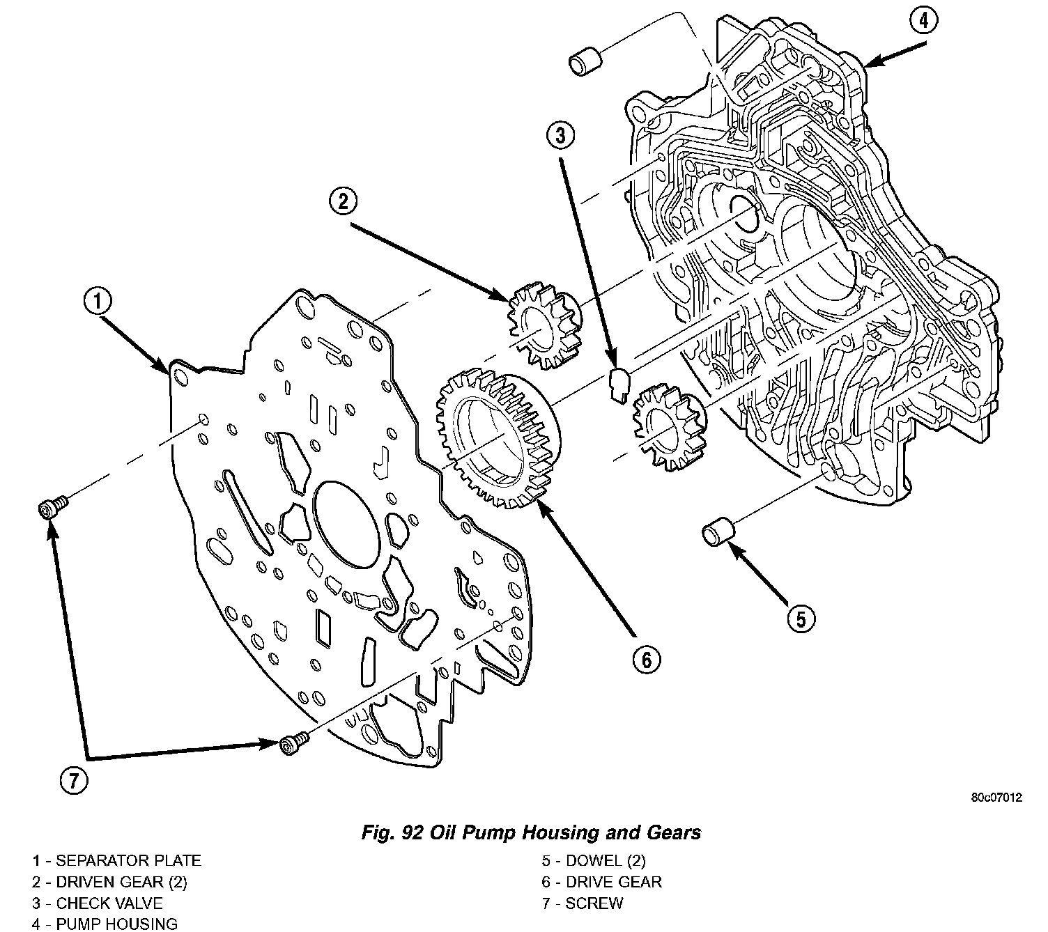 5. Install the screws to hold the separator plate onto the oil pump body (Fig. 92). Tighten the screws to 4.5 Nm (40 in. lbs.).