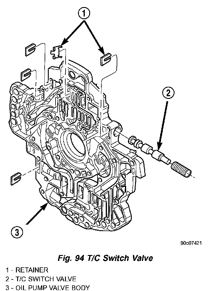 3. Lubricate the oil pump valves with Mopar ATF +4, type 9602, and install the valve, spring and retainer into the appropriate oil pump valve body bore (Fig. 93) (Fig. 94).