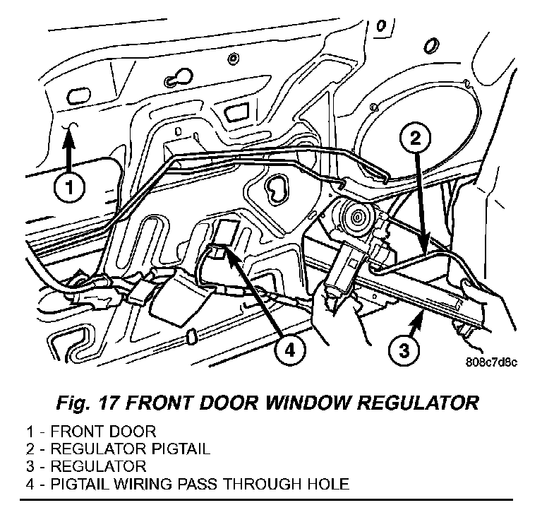 7. Lift regulator upward to disengage bolts from door inner panel (Fig. 17).