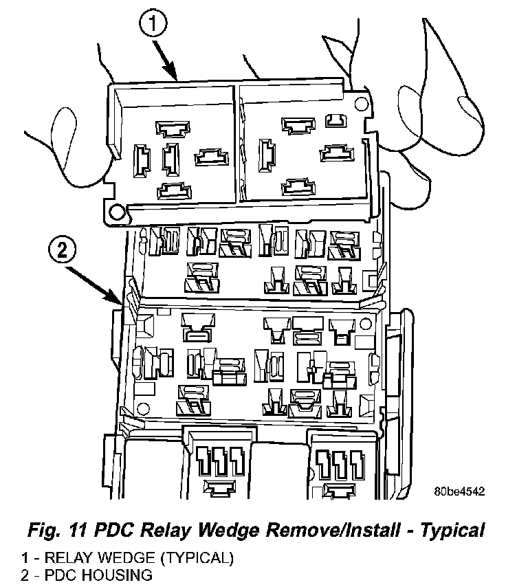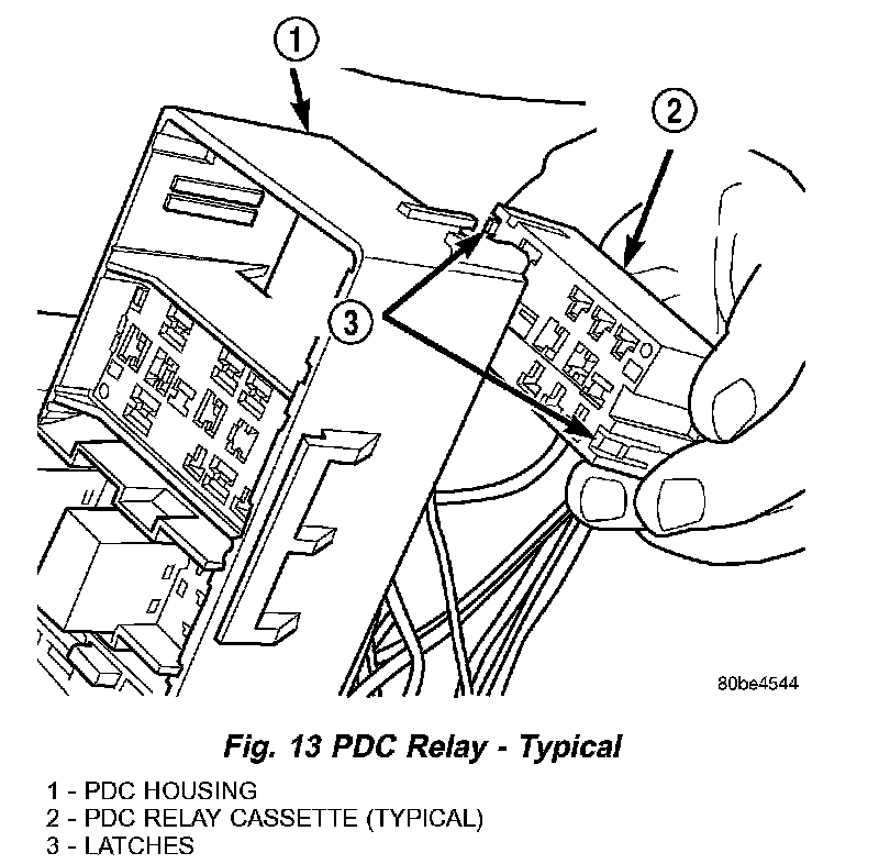 CAUTION: Proper care must be taken to be certain that the wiring and terminals from the faulty PDC relay cassette are installed in the correct terminal cavities of the replacement relay cassette. To prevent mistakes it is recommended that the wiring and terminals be removed from the faulty relay cassette one cavity at a time, repaired or spliced as necessary, then installed securely into the correct cavity of the replacement relay cassette. If you are not absolutely certain into which cavity a terminal should be installed, refer to Power Distribution in the index of this service manual for the location of complete circuit diagrams covering the PDC.