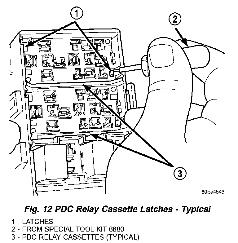 2. From the top of the PDC housing, use a small screwdriver or a terminal pick tool (Special Tool Kit 6680) to release the two latches that secure the relay cassette in the PDC (Fig. 12).