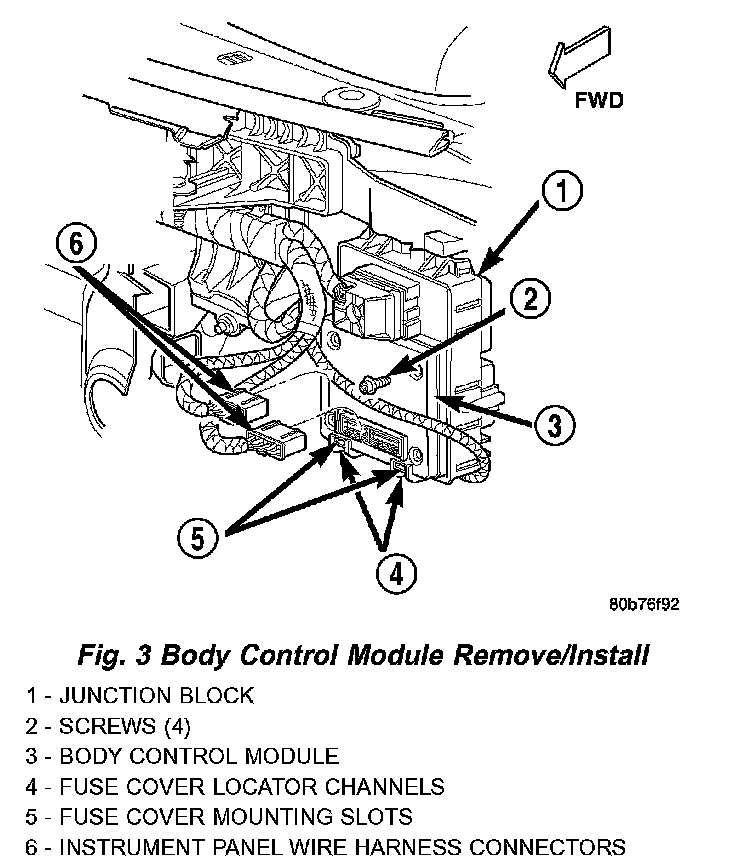 6. Reinstall the instrument panel fuse cover to the bottom of the BCM and JB unit. (Refer to ELECTRICAL/POWER DISTRIBUTION/FUSE COVER - INSTALLATION).