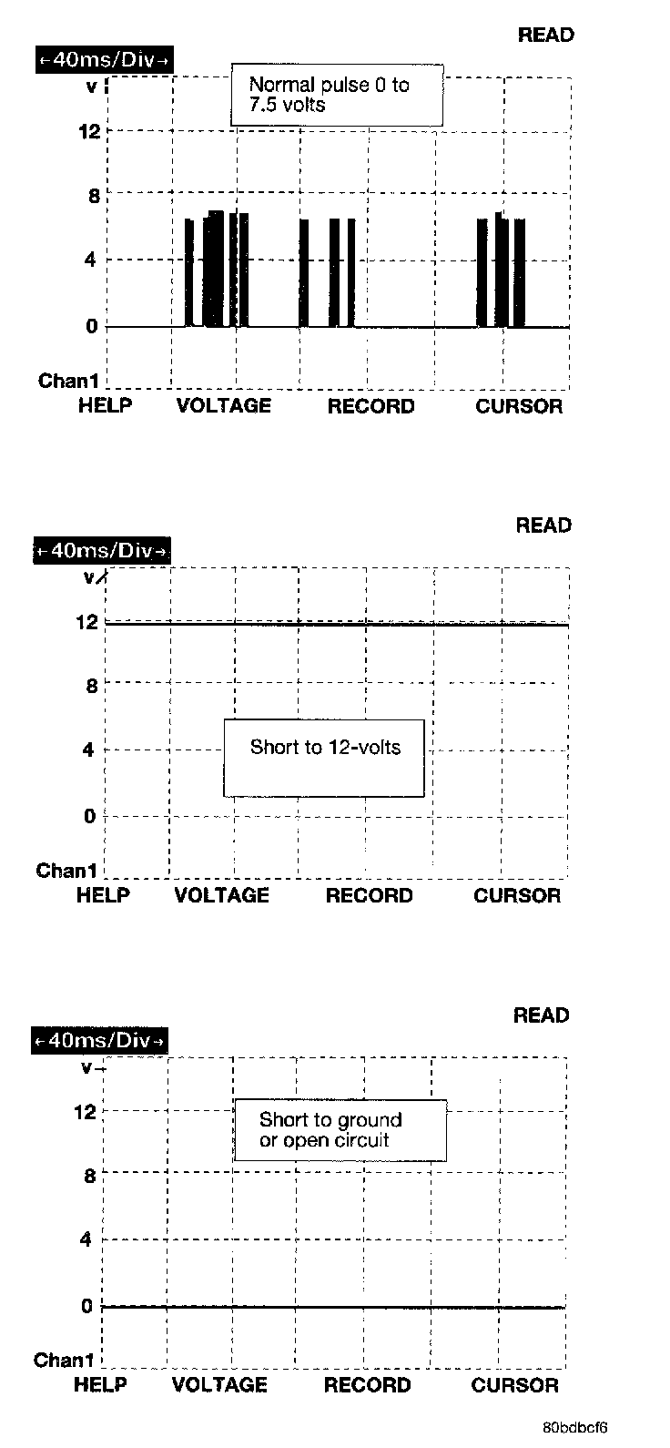 Data exchange between modules is achieved by serial transmission of encoded data over a single wire broadcast network. The PCI data bus messages are carried over the bus in the form of Variable Pulse Width Modulated (VPWM) signals. The PCI data bus speed is an average 10.8 Kilo-bits per second (Kbps). Since there is only voltage present when the modules transmit and the message length is only about 500 milliseconds, it is ineffective to try and measure the bus activity with a conventional voltmeter. The preferred method is to use DRB III lab scope. The 12v square wave selection on the 20-volt scale provides a good view of the bus activity. Voltage on the bus should pulse between 0 volts and about 7-1/2 volts. Refer to the figure for some typical displays.