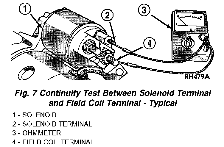 3. Check for continuity between the solenoid terminal and the solenoid field coil terminal with a continuity tester (Fig. 7). There should be continuity. If OK, go to Step 4. If not OK, replace the faulty starter motor assembly.