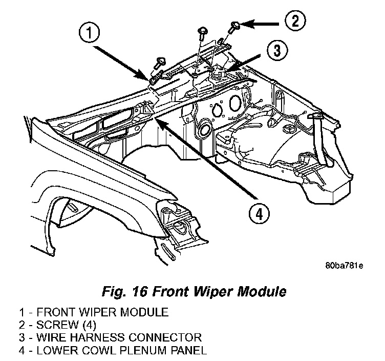 The front wiper module bracket is secured with four screws through four rubber insulators to the cowl plenum panel beneath the cowl plenum coven grille panel. The ends of the wiper pivot shafts that protrude through dedicated openings in the cowl plenum cover/grille panel to drive the wiper arms and blades are the only visible components of the front wiper module. The front wiper module consists of the following major components: