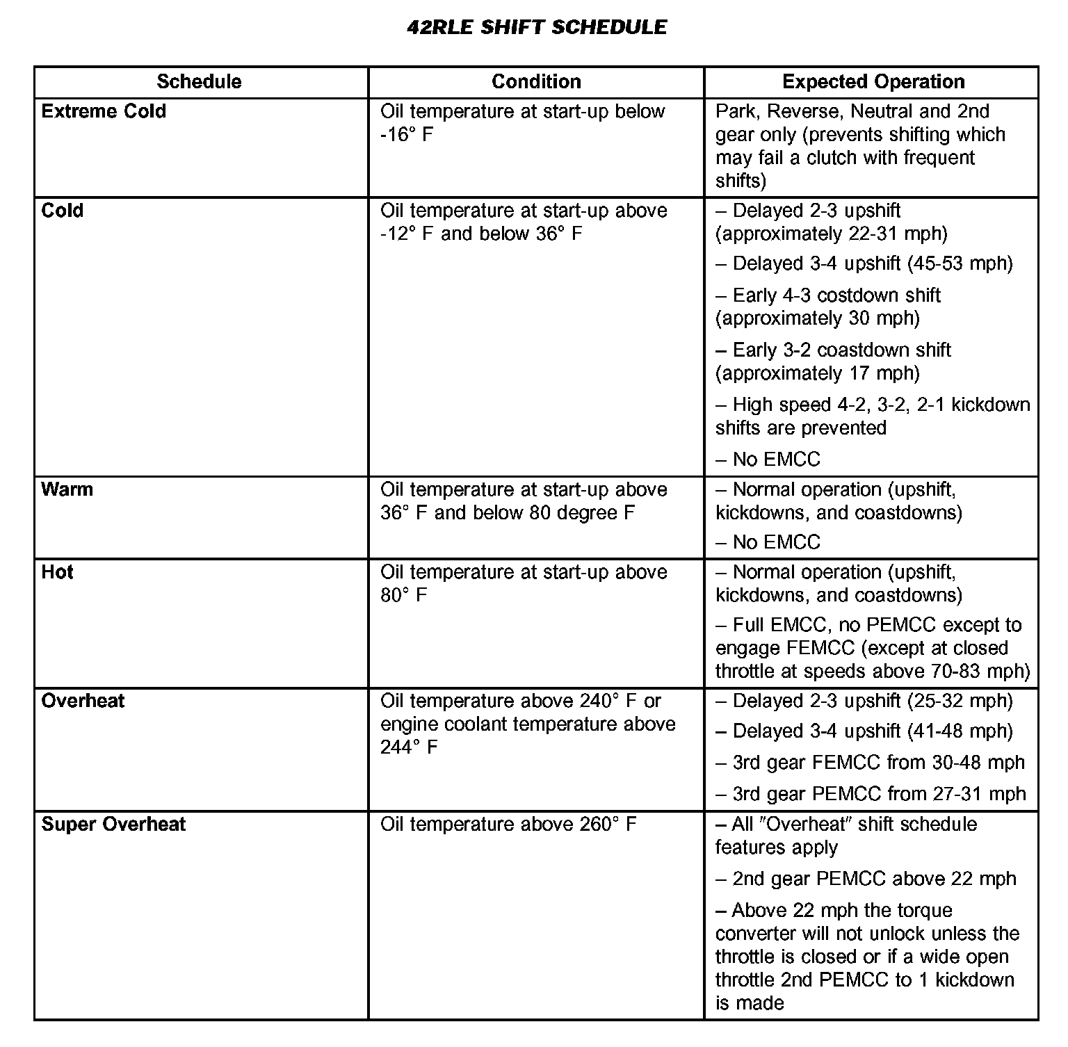 As driving conditions change, the TCM appropriately adjusts the shift schedule. Refer to the following table 42RLE Shift Schedule to determine the appropriate operation expected, depending on driving conditions.