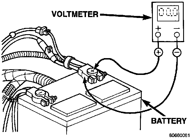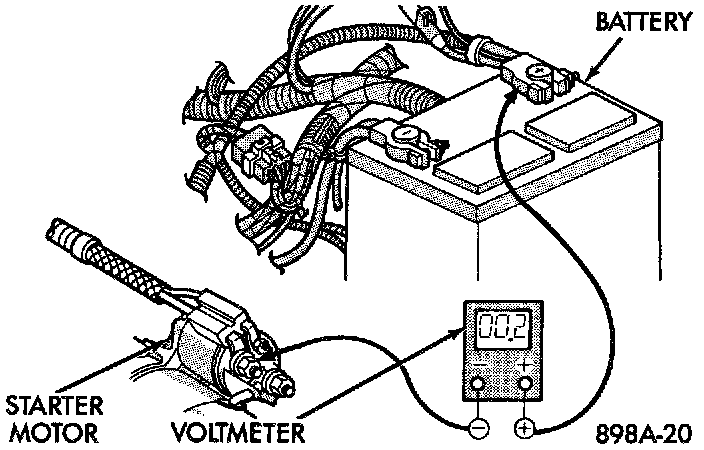 1. Connect the positive lead of the voltmeter to the battery negative terminal post. Connect the negative lead of the voltmeter to the battery negative cable terminal clamp. Rotate and hold the ignition switch in the Start position. Observe the voltmeter. If voltage is detected, correct the poor connection between the battery negative cable terminal clamp and the battery negative terminal post.