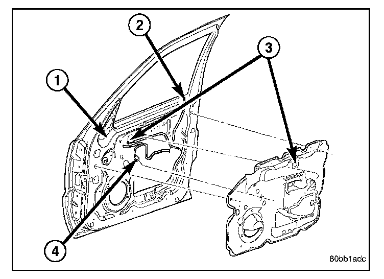 3. Raise the glass (4) to the position shown and using a long flat blade or hook type tool, disengage clips (1) attaching glass retainer to regulator lift plate (3).
