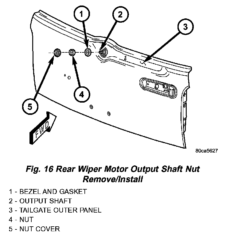 5. Remove the bezel and gasket from the rear wiper motor output shaft.