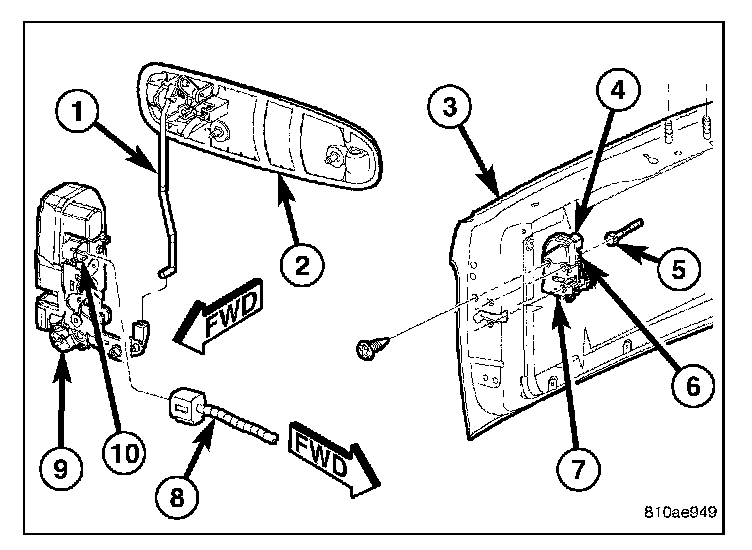 CAUTION: Make sure the latch wire harness is installed forward of the actuator rod.