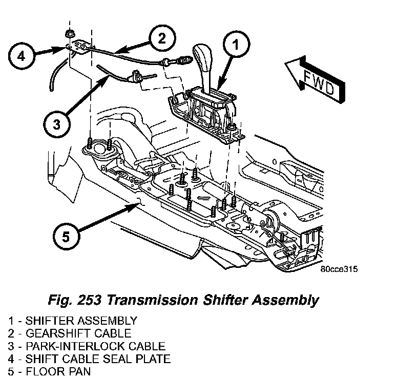 6. Remove all nuts holding the shifter assembly to the floor pan (Fig. 253).