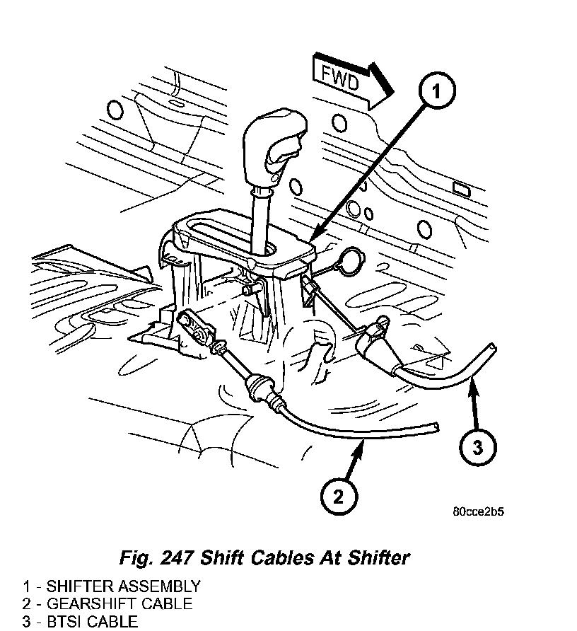 5. Disconnect the park-interlock cable from the shift lever assembly and remove the cable from the shifter assembly bracket (Fig. 247).
