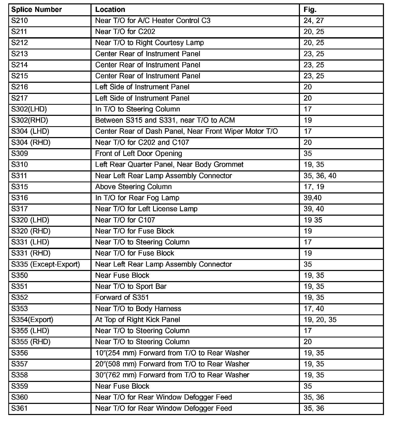 The abbreviation T/O (Take Out) is used in the location column to indicate a point in which the wiring harness branches out to a component.
