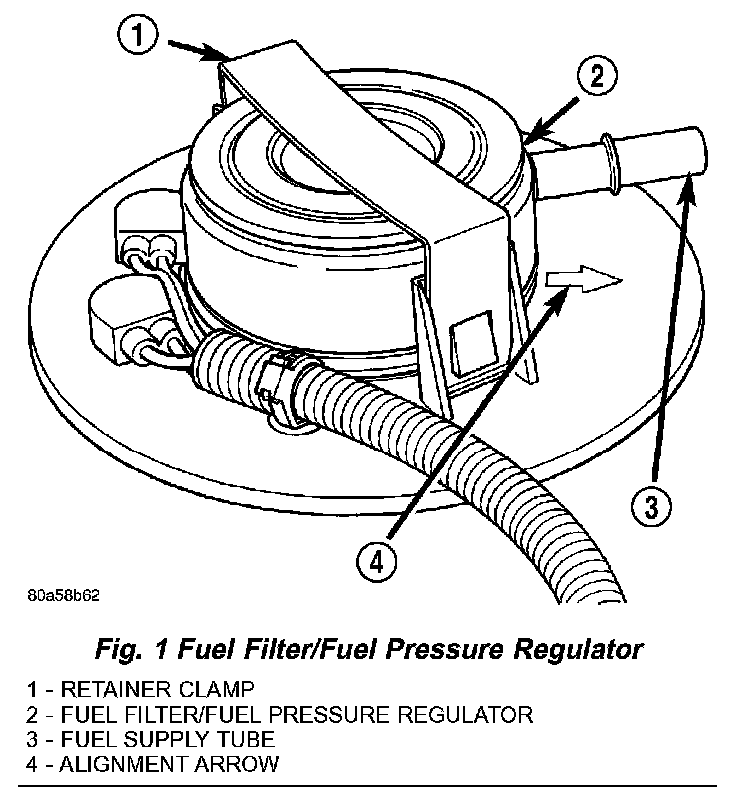 4. Remove retainer clamp from top of filter/regulator (Fig. 1). Clamp snaps to tabs on pump module. Discard old clamp.