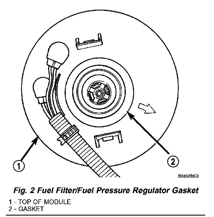 6. The molded arrow (Fig. 1) on top of fuel pump module should be pointed towards front of vehicle (12 o'clock position).