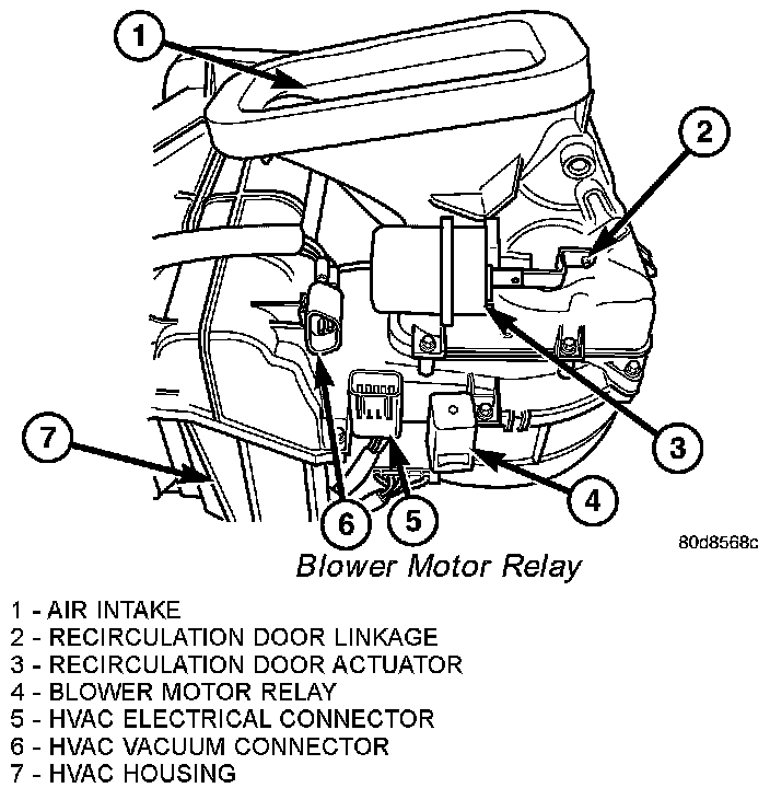 3. Locate the blower motor relay through the instrument panel glove box opening. The relay is mounted upright and to the right of the instrument panel harness.