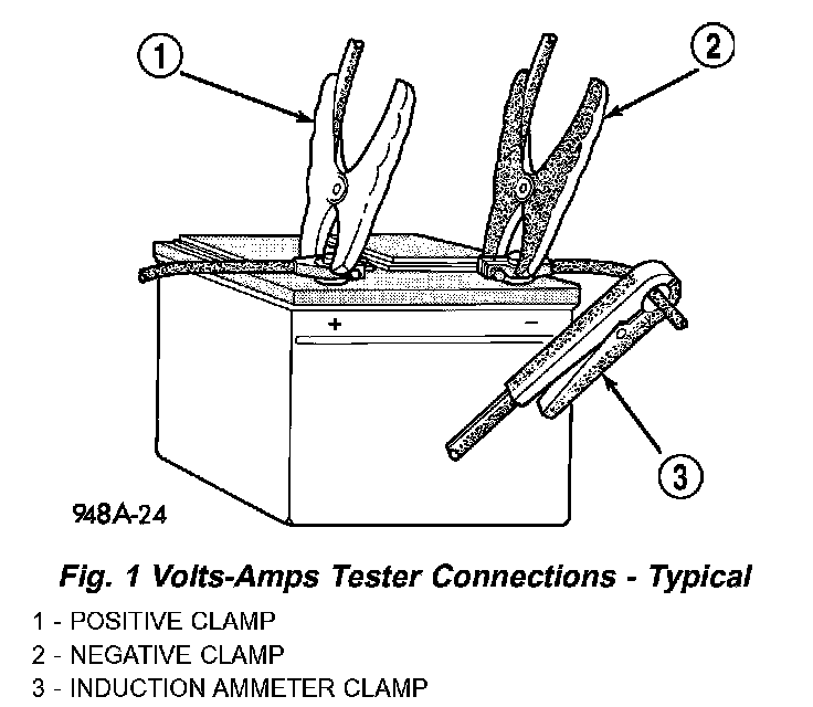 1. Connect a suitable volt-ampere tester to the battery terminals (Fig. 1). See the instructions provided by the manufacturer of the volt-ampere tester being used.