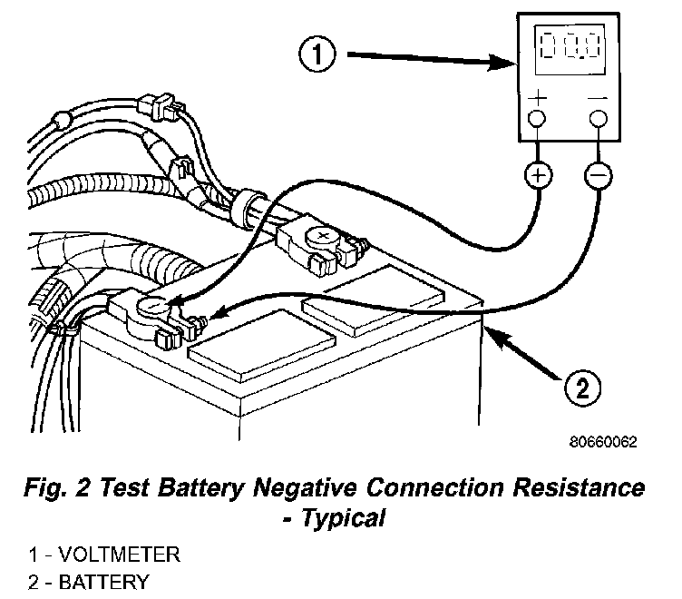 1. Connect the positive lead of the voltmeter to the battery negative terminal post. Connect the negative lead of the voltmeter to the battery negative cable terminal clamp (Fig. 2). Rotate and hold the ignition switch in the Start position. Observe the voltmeter. If voltage is detected, correct the poor contact between the battery negative cable terminal clamp and the battery negative terminal post.