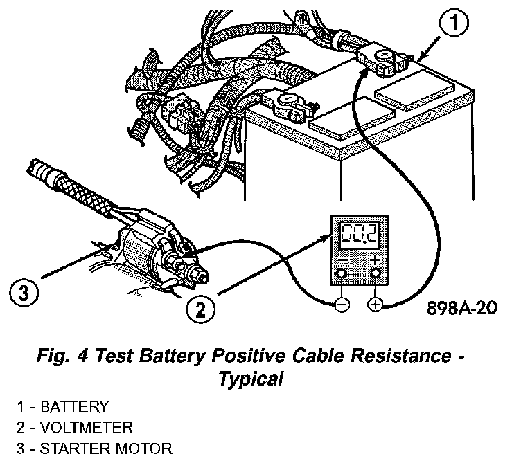 3. Connect the voltmeter to measure between the battery positive cable terminal clamp and the starter solenoid B(+) terminal stud (Fig. 4). Rotate and hold the ignition switch in the Start position. Observe the voltmeter. If the reading is above 0.2 volt, clean and tighten the battery positive cable eyelet terminal connection at the starter solenoid B(+) terminal stud. Repeat the test. If the reading is still above 0.2 volt, replace the faulty battery positive cable.