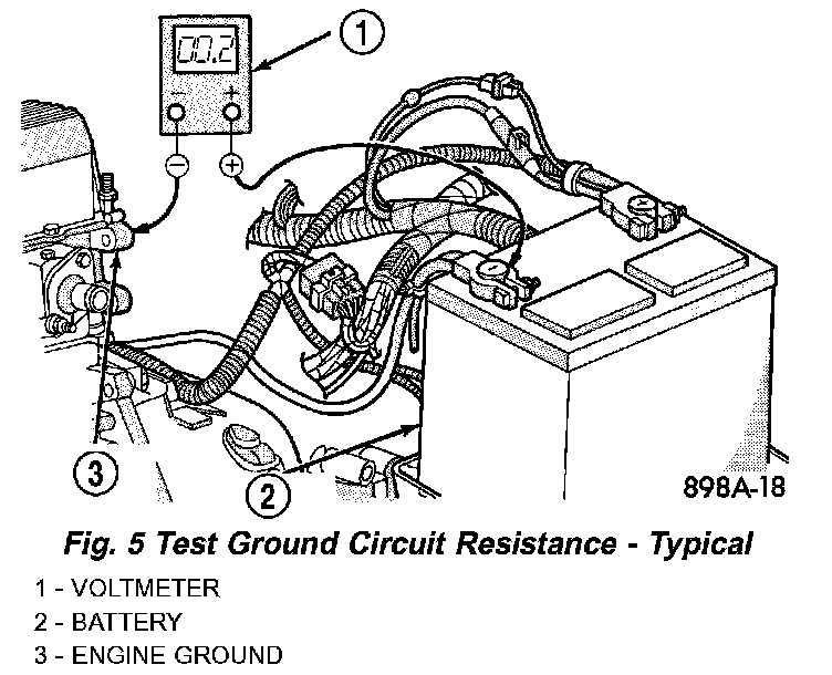 4. Connect the voltmeter to measure between the battery negative cable terminal clamp and a good clean ground on the engine block (Fig. 5). Rotate and hold the ignition switch in the Start position. Observe the voltmeter. If the reading is above 0.2 volt, clean and tighten the battery negative cable eyelet terminal connection to the engine block. Repeat the test. If the reading is still above 0.2 volt, replace the faulty battery negative cable.