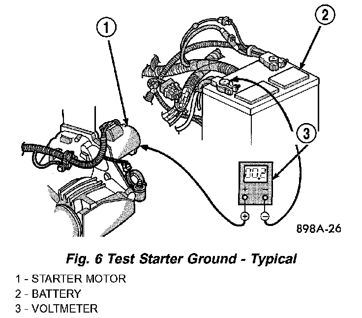 5. Connect the positive lead of the voltmeter to the starter housing. Connect the negative lead of the voltmeter to the battery negative terminal post (Fig. 6). Rotate and hold the ignition switch in the Start position. Observe the voltmeter. If the reading is above 0.2 volt, correct the poor starter to engine block ground contact.
