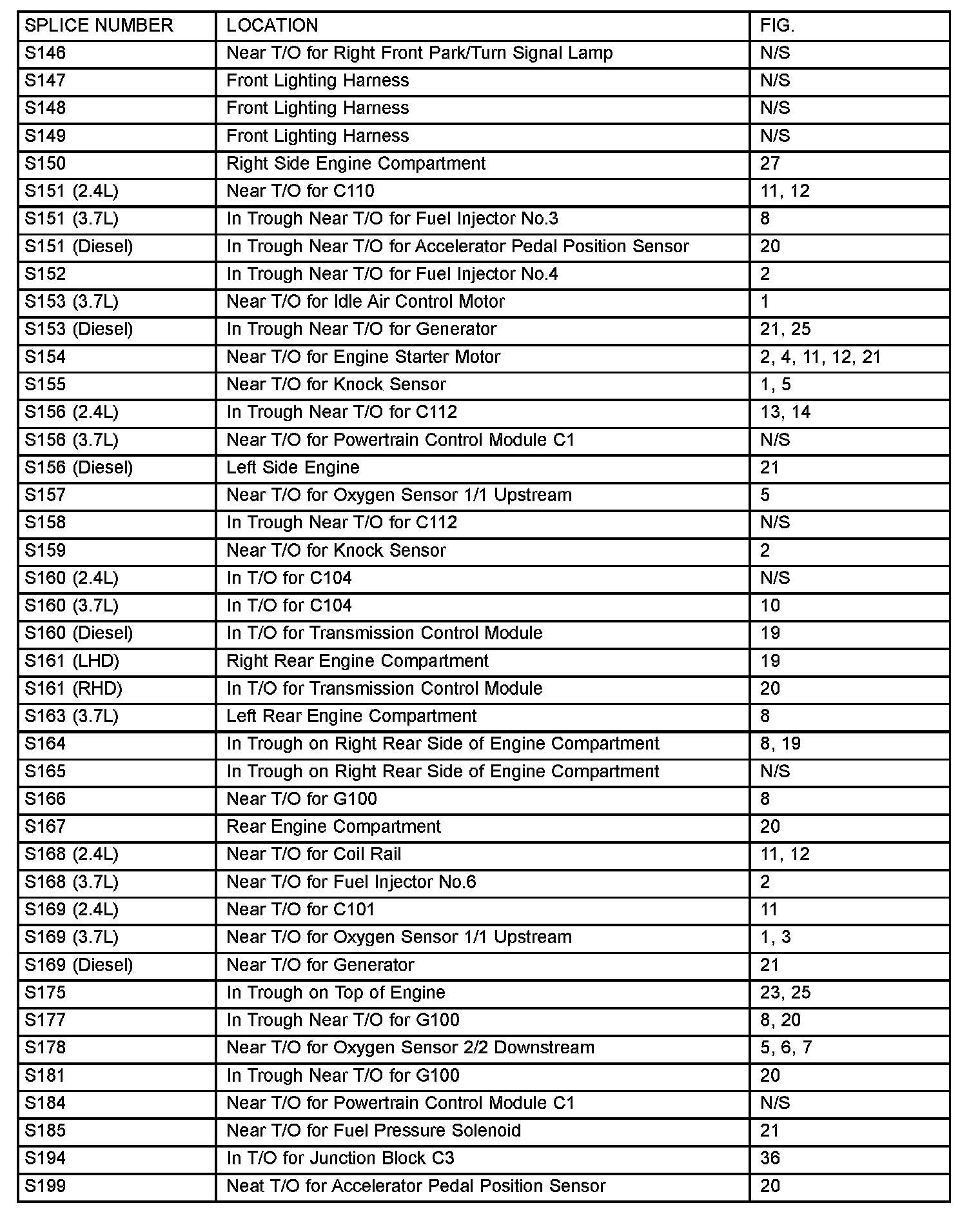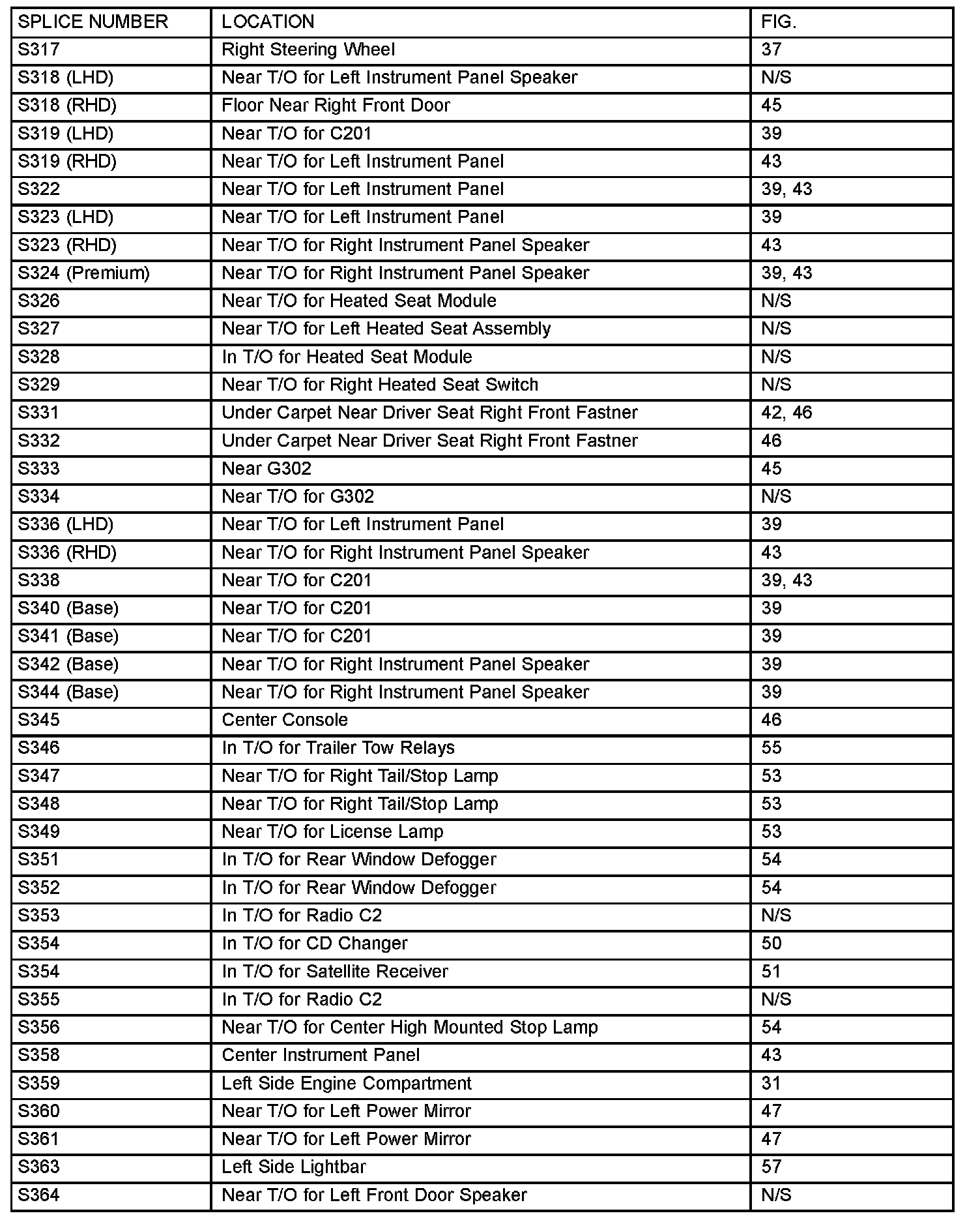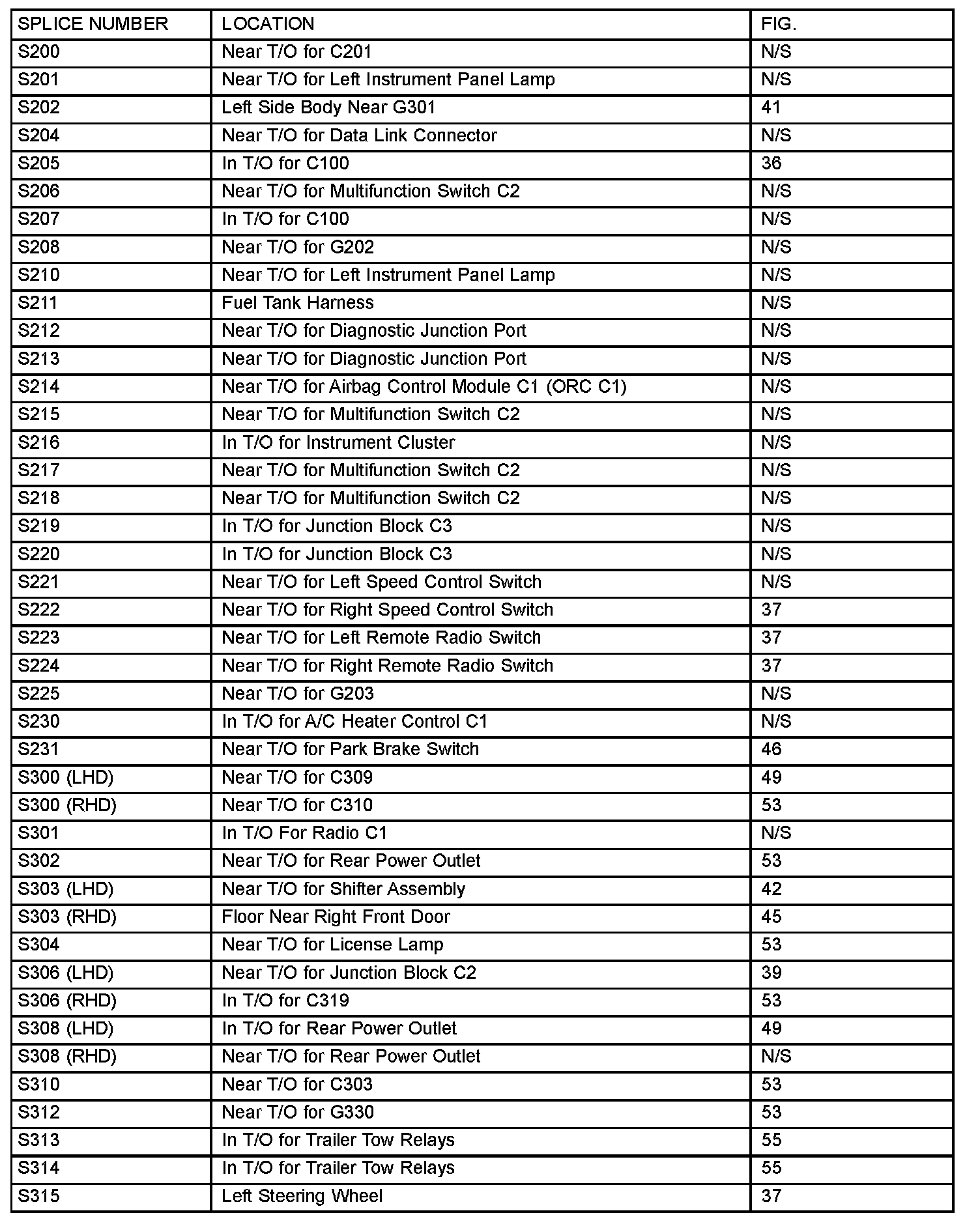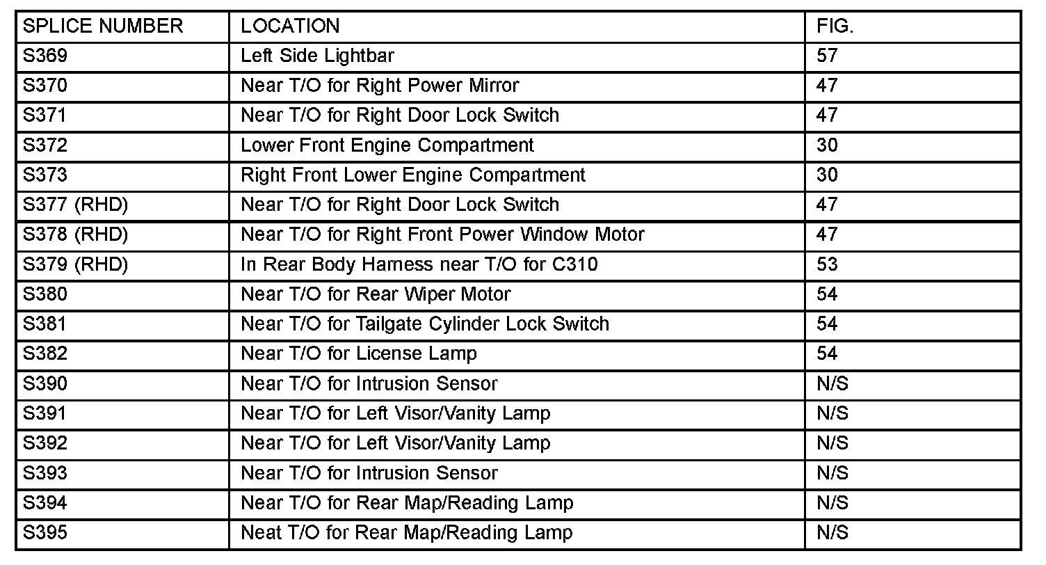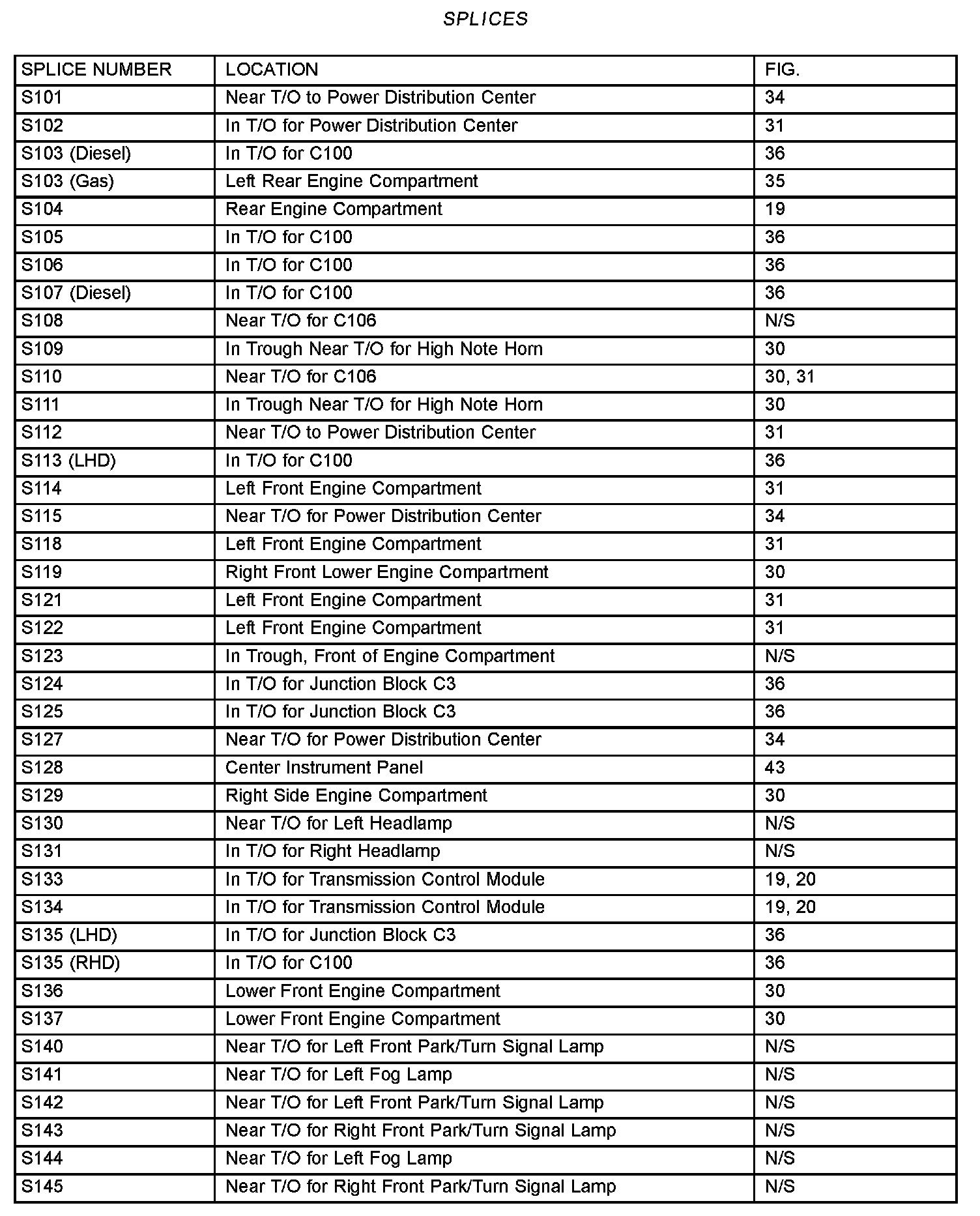 The abbreviation T/O (Take Out) is used in the location column to indicate a point in which the wiring harness branches out to a component.