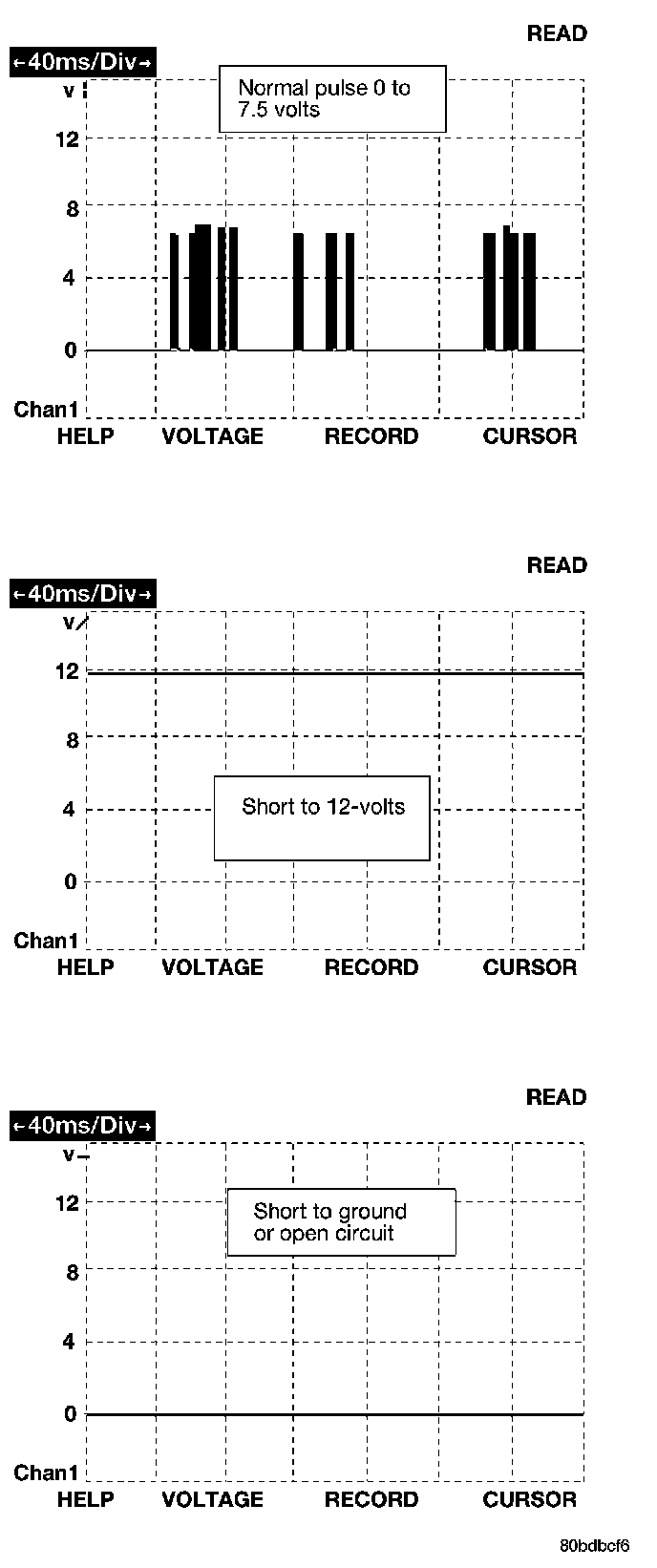 The bus messages are transmitted at a rate averaging 10800 bits per second. Since there is only voltage present when the modules transmit and the message length is only about 500 milliseconds, it is ineffective to try and measure the bus activity with a conventional voltmeter. The preferred method is to use the DRBIII(R) lab scope. The 12 v square wave selection on the 20-volt scale provides a good view of the bus activity. Voltage on the bus should pulse between zero and about seven and a half volts. Refer to figure for some typical displays.