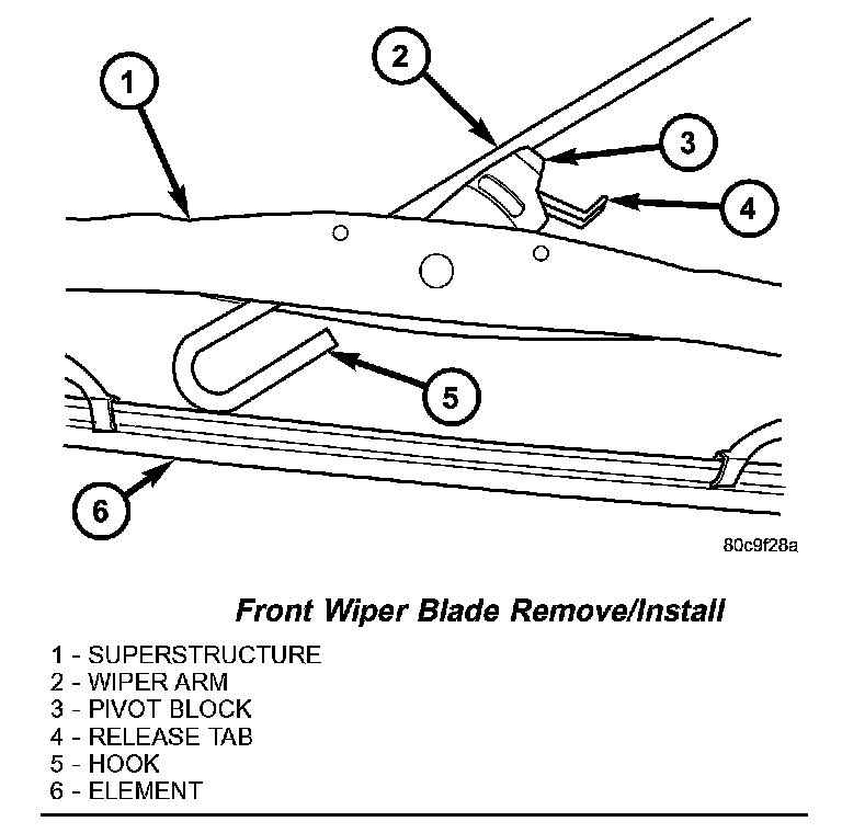 1. Lift the front wiper arm to raise the wiper blade and element off of the glass, until the wiper arm hinge is in its over-center position.