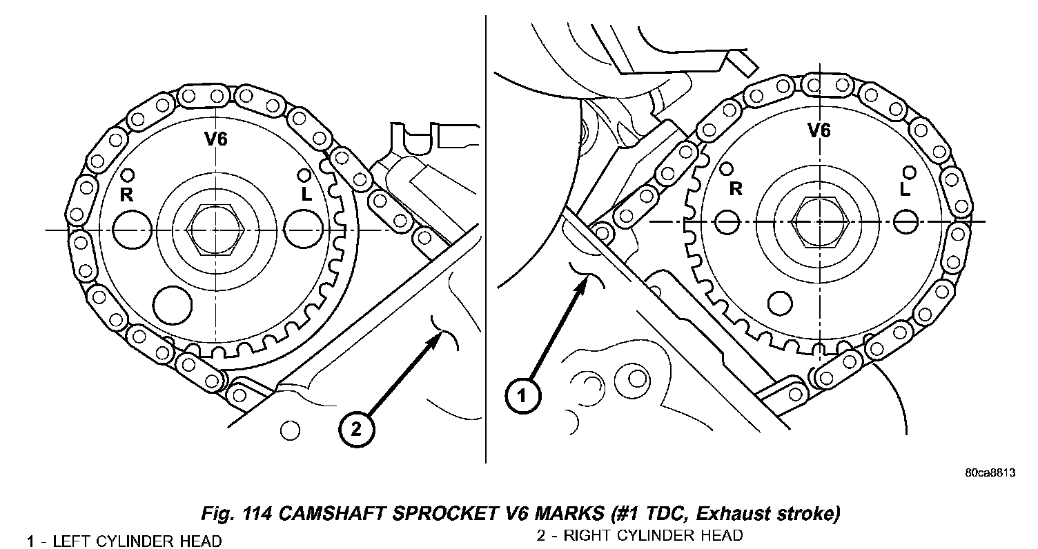 3. Note the location of the V6 mark stamped into the camshaft drive gears (Fig. 114) (1,2). If the V6 mark on each camshaft drive gear is at the twelve o'clock position, the engine is at TDC on the exhaust stroke. If the V6 mark on each gear is at the six o'clock position, the engine is at TDC on the compression stroke.