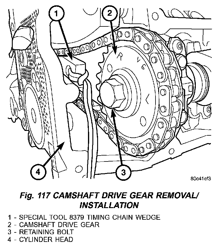 2. Remove the camshaft drive gear retaining bolt (Fig. 117) (3).