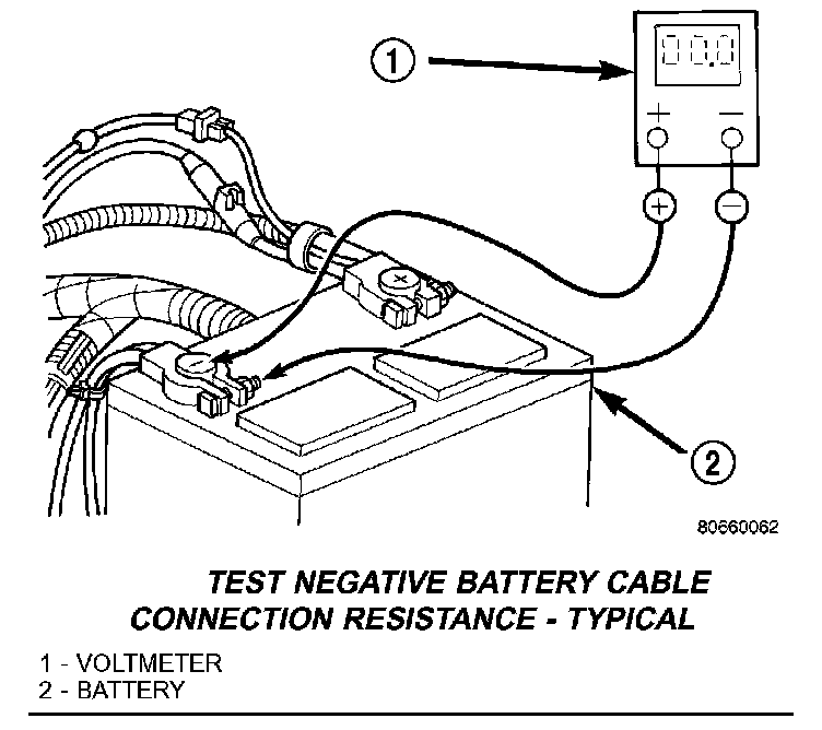 1. Connect positive lead of voltmeter to negative battery cable terminal post Connect negative lead of voltmeter to negative battery cable clamp.Rotate and hold ignition switch in Start position. Observe voltmeter. If voltage is detected, correct poor contact between cable clamp and terminal post.