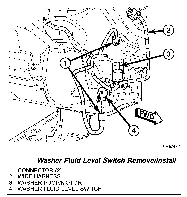 REMOVALNOTE: The washer fluid level switch can be removed from the washer reservoir without removing the reservoir from the vehicle.