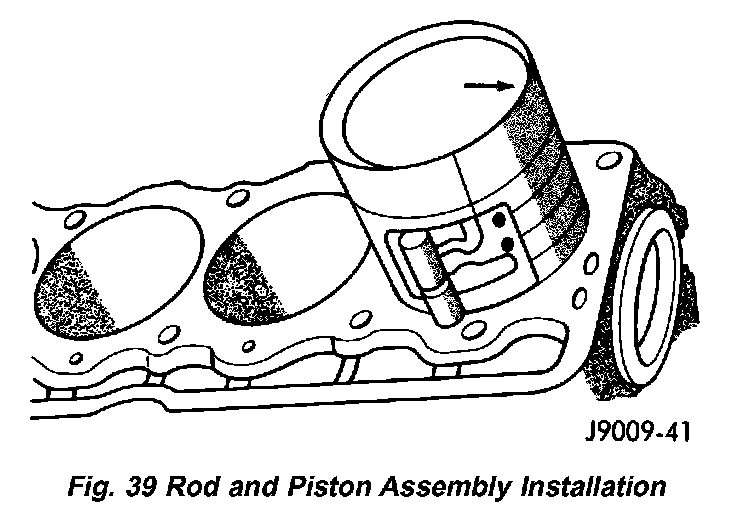 4. Use piston ring compressor to install the rod and piston assemblies. The oil squirt holes in the rods must face the camshaft. The arrow on the piston crown should point to the front of the engine (Fig. 39). Verify that the oil squirt holes in the rods face the camshaft and that the arrows on the pistons face the front of the engine.