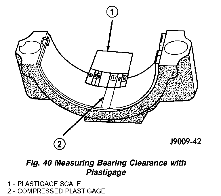 7. Remove the bearing cap and determine amount of bearing-to- journal clearance by measuring the width of compressed Plastigage (Fig. 40). Plastigage should indicate the same clearance across the entire width of the insert. If the clearance varies, it may be caused by either a tapered journal, bent connecting rod or foreign material trapped between the insert and cap or rod.
