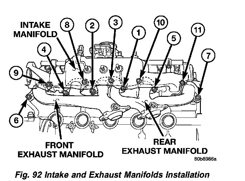 14. Remove the intake manifold and exhaust manifold bolts and manifolds (Fig. 92).