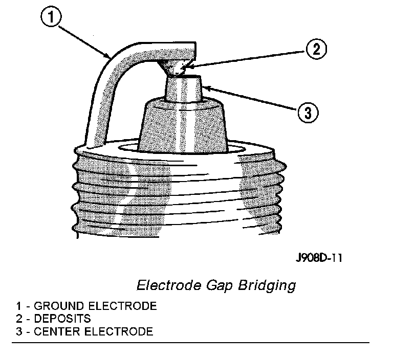 Electrode gap bridging may be traced to loose deposits in the combustion chamber. These deposits accumulate on the spark plugs during continuous stop-and-go driving. When the engine is suddenly subjected to a high torque load, deposits partially liquefy and bridge the gap between electrodes. This short circuits the electrodes. Spark plugs with electrode gap bridging can be cleaned using standard procedures.