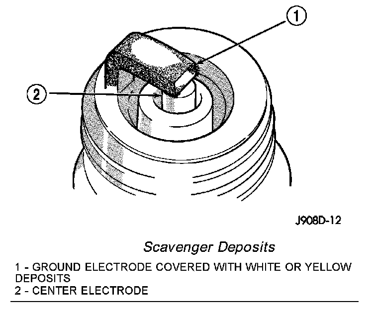 Fuel scavenger deposits may be either white or yellow. They may appear to be harmful, but this is a normal condition caused by chemical additives in certain fuels. These additives are designed to change the chemical nature of deposits and decrease spark plug misfire tendencies. Notice that accumulation on the ground electrode and shell area may be heavy, but the deposits are easily removed. Spark plugs with scavenger deposits can be considered normal in condition and can be cleaned using standard procedures.