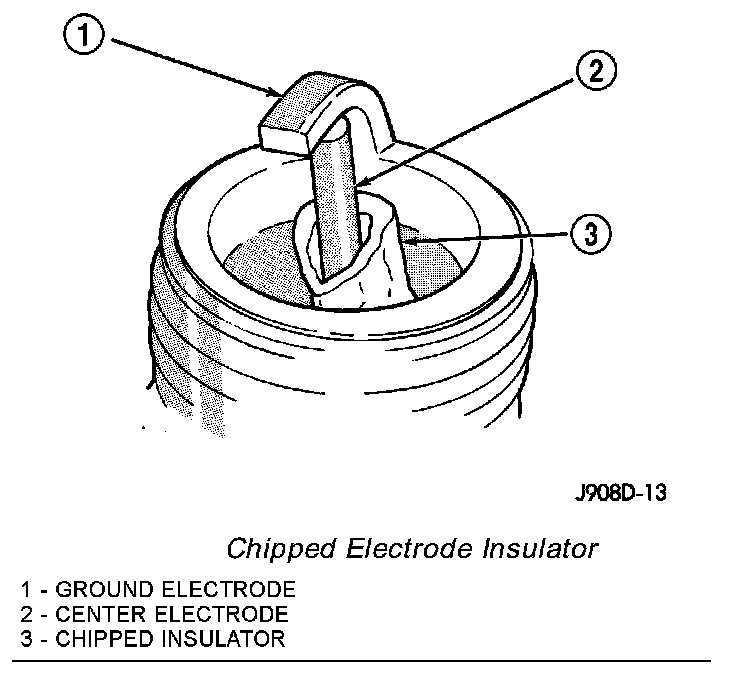 A chipped electrode insulator usually results from bending the center electrode while adjusting the spark plug electrode gap. Under certain conditions,severe detonation can also separate the insulator from the center electrode. Spark plugs with this condition must be replaced.
